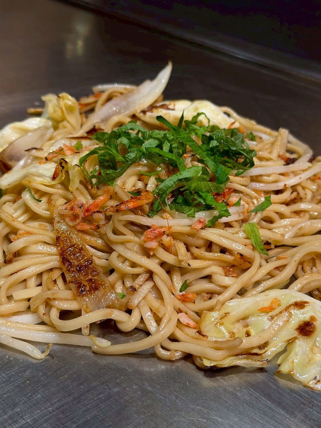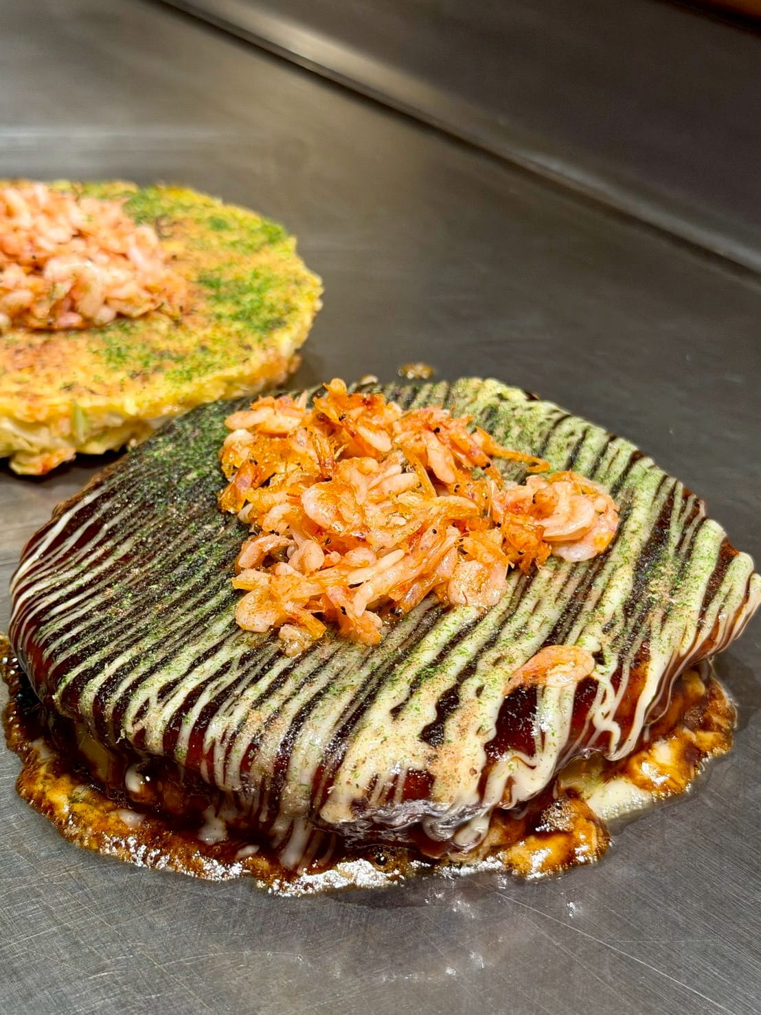 A Chinese-inspired monjayaki with plump shrimp and perfectly paired spicy chili sauce.